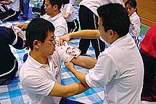 スポーツインストラクターはいつ救急現場に遭遇するか分かりません。万が一の緊急事態に備えて、心肺蘇生法や三角巾を使った外傷の手当て(包帯法)、止血、傷病者搬送法について学びました。