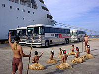グアムでの様々な活動を控え、期待に胸を躍らせながら下船するメンバーを、グアムの伝統的なダンスが出迎えてくれました。