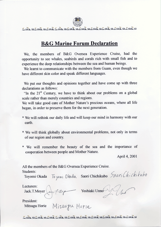 私達の意見をまとめることができましたので、以下の宣言をいたします。『21世紀は、国や地域にとらわれず、地球全体で色々な問題を考えなければいけない世紀だと考えます。私達は、私達人類の生命を生み、育んできたこの美しい地球を、私達のため、未来のために、地球の生命の源、母なる海を大切にします。』