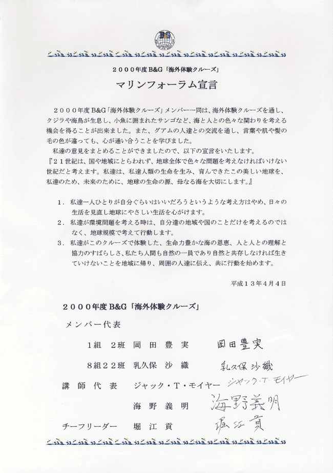 2000年度B&G「海外体験クルーズ」メンバー一同は、海外体験クルーズを通し、クジラや海鳥が生息し、小魚に囲まれたサンゴなど、海と人との色々な関わりを考える機会を得ることが出来ました。また、グアムの人達との交流を通し、言葉や肌や髪の毛の色が違っても、心が通い合うことを学びました。