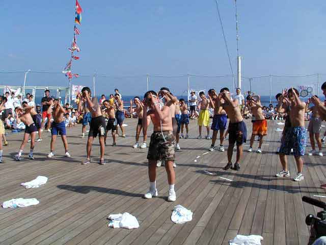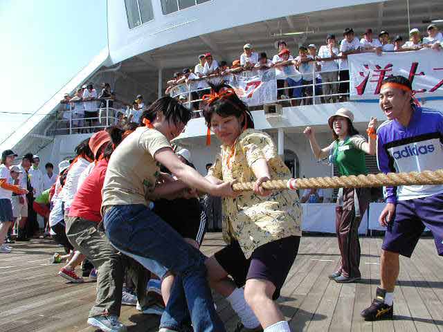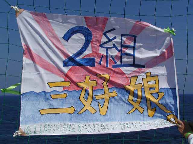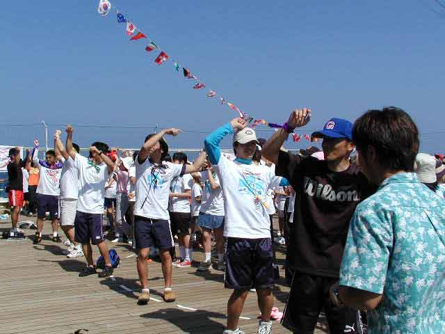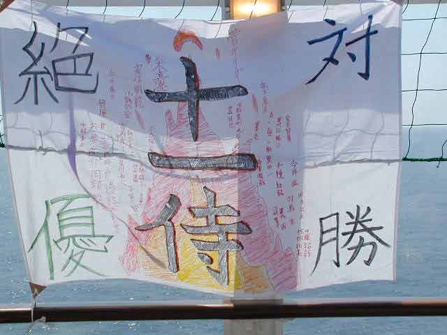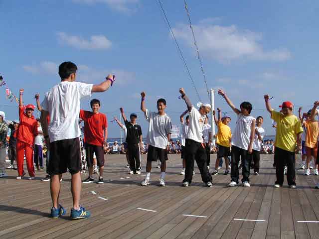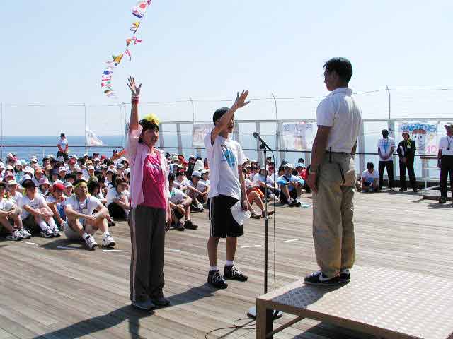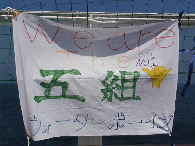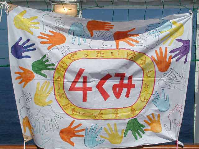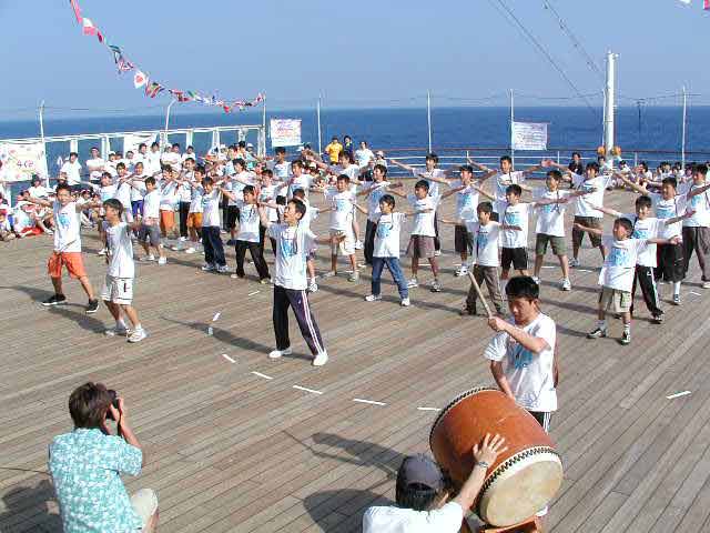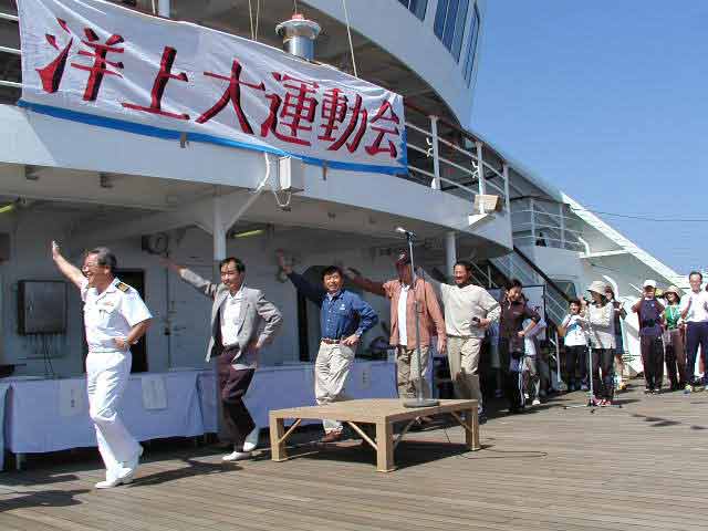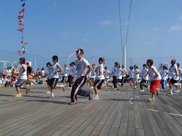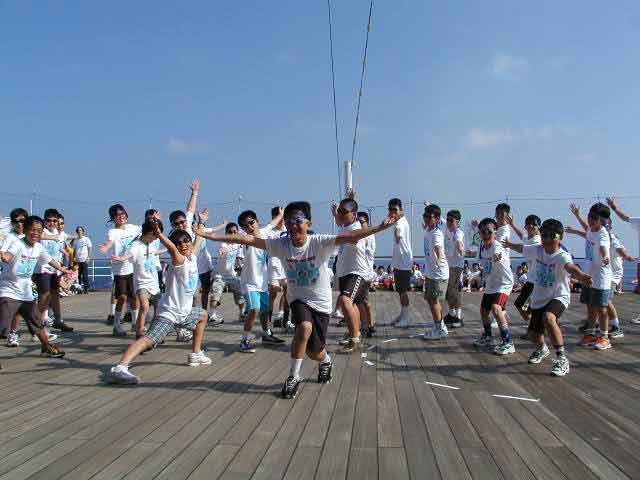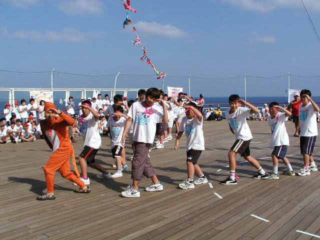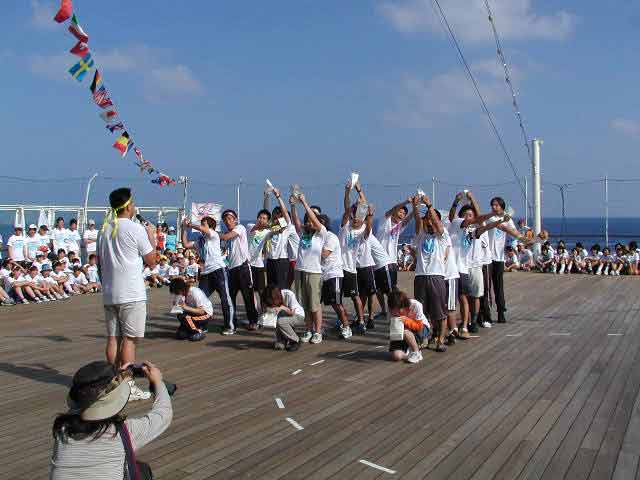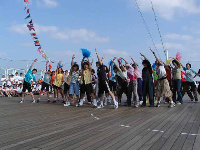 真っ青な空の下、今日は力いっぱい洋上フェア♪みんなで一生懸命に練習した応援合戦はバッチリ決まってたね!