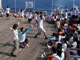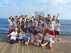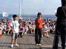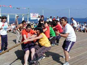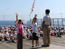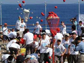 フェアの第一種目は組対抗によって行なわれた「玉入れ」でした。船の揺れや風のため、なかなか思うように玉が入らない混戦を制したのは、男子の部が菅井リーダー率いる11組、女子の部が石井リーダー率いる6組でした。