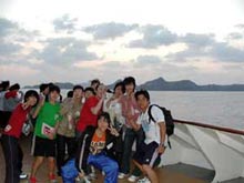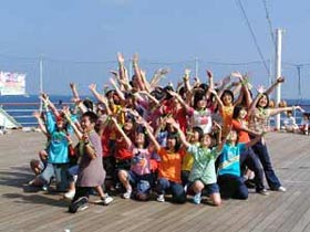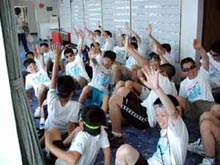 昨日からはじめた、洋上フェアで行なう応援合戦の練習風景です。どの組も少ない練習時間を補うため、自由時間をけずったり早めに集合するなど、工夫し協力し合って行動する姿が目立つようになりました。