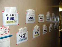 事務局(リーダーたちの仕事部屋)に備え付けられた、各組ごとの受信メール用ポストです。随時プリントアウトされたメールがこのポストに入れられ、受け取ったリーダーからメンバーに配布される仕組みになっています。2日現在で約950件のメールが届けられました。船内からの送受信は、スケジュールの都合により明日(3日)の午前中で終了となります。