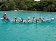 10人でサバニ。ずるしないで漕いでくれ〜 |