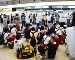 ![]() 田中リーダーの説明を聞く参加者。 「羽田空港に来たのは初めて!どきどきしちゃう。」 |