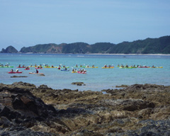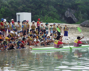 ペアカヌーは、2人で仲良く漕ぐのがコツだよ! 2人で呼吸を合わせないと、真っ直ぐに進まないぞ。 |