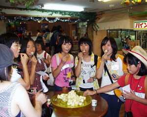 ![]() あまくて、おいしい〜、パイナップルを試食中。 「パイナップル、大好き〜!!」 |