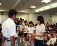 ![]() イルカにタッチ 「イルカさん、こんにちは。よろしくね。」 |