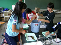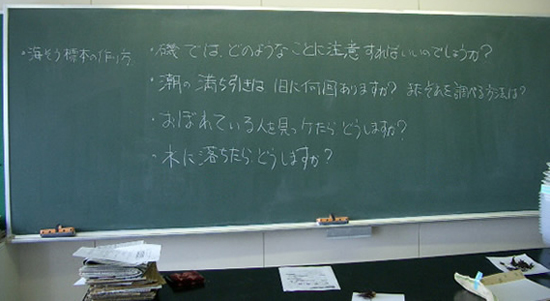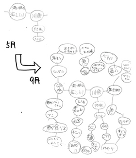 児童たちは、「瀬棚の海と川」から想像するものをウエビィング図として、記入しています。 「水に賢いこどもを育む年間型プログラム」が始った当初は、2〜3個しか記入できませんでしたが、プログラムが進むにつれて、色々な体験をしたためか、9月には、多くの児童が「瀬棚の海と川」から、多くを連想できるようになりました。