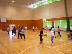 島根県雲南市加茂のB&G海洋センター及び加茂健康福祉センターかもてらすで、隔週木曜日の午後1時30分から「転倒・寝たきり予防プログラム」『遊学スマイルクラブ』が開催中です。2期生となる今期は、昨年度からの継続者も含め50代から70歳までの31人がメンバー。月2回の教室で定期的に体を動かし、また幅広く健康に生活するための知識を深めています。 加茂の教室は、3B体操を取り入れていることが特徴の一つです。これは、ボール、ベル、ベルターを運動の助けとして使用しながら、全ての動きを音楽に合わせて集団で行う健康体操で、加茂でとてもさかんな体操だそうです。色とりどりの道具は、気分を明るくさせ、楽しい教室運営に一役買っているようです。
