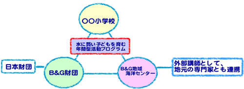 平成17年度は、瀬棚小学校(北海道瀬棚町)・名久井小学校(青森県南部町)・吉海小学校(愛媛県今治市)の3校が、年間を通じて、同プログラムを活用することが決定しました。なお、瀬棚小学校(北海道)は、昨年度全国初で同プログラムを導入し、今年度が2年目となります。 各学校とも「総合的な学習の時間」の年間テーマが水に関するものに設定し、年間を通して、このプログラムを展開。B&G財団のスタッフも年に数回、授業に参加して、指導等で協力します。