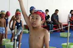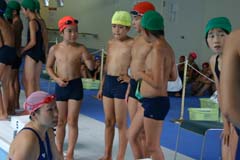 練習では、コーチの、「いっち に いっち にっ」 「みんなで声出してー」のアドバイスに子どもたちも声を揃えて「いっち に いっち に」。 プールサイドでも「いっち に いっち に」