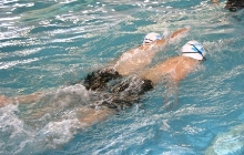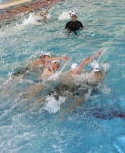 着替えを済ませ、プールサイドに集まった参加者は、準備体操、ウォームアップをした後、10時からトライアスロンスイムの基礎練習を行いました。2人や4人で並んで泳ぐ練習、ブイを使ったターン練習など実践的な練習を行いました。
