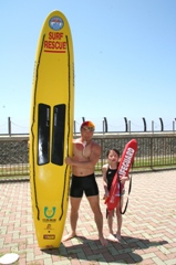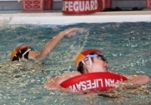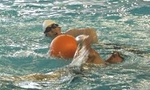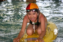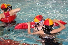 11時からは、レスキューチューブやボードを使っての救助練習。参加者のほとんどが始めての体験でしたが、インストラクターの熱心な指導の下で、皆さん楽しそうにチャレンジしていました。