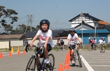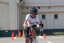 ヘルメットを素早く装着する練習、バイクに乗ってのバランス練習、スラローム練習などを行いました。