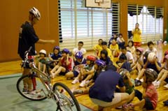 続いて、トライアスロンのバイクの説明を受けました。ヘルメットのかぶり方を習い、誰が早くかぶれるか競争。本番のレースでは、1秒でも早くヘルメットを装着しなくてはなりません。