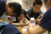 また、グループに分かれ、用意された3つの砂を顕微鏡やルーペで観察して、“どこ(どういった)の砂浜の砂なのか”を想像してグループ毎に話し合うグループワーキングも行いました。