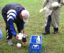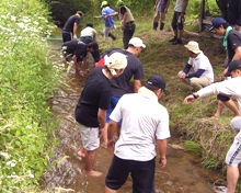 つぎに、参加者はブロック別に分かれ、各地域で実際に“親子ふれあいキャンプ”を実施する際の活動場所、プログラム内容などについてグループディスカッションを行いました。その後は“サバイバルゲーム”。班ごとに分かれて、草むらの中に隠された食材を探して獲ります。獲った食材だけで夕食を準備しなければならないので、みんなかなり真剣に探していました。