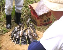 自作の竹串に刺し釜戸で焼きます