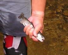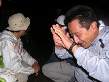 ナイトウォークを終え笑みを浮かべる参加者。後続を待ちますこの日、最初のプログラムはロープワーク。小野田理事長から直接指導を受けました。つぎに、マスつかみをするため、約10分ほど歩いて川まで移動。参加者は悪戦苦闘しながらマスを捕まえます。捕まえたマスは自分でさばき、塩を付け、自作の竹串に刺し釜戸で焼きます。マスの塩焼きとおにぎりの味は格別でした。
