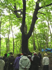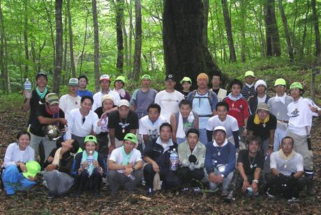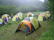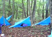 樹齢数百年といわれる、樹高30mを超すミズナラの大木。ポイントに到着。到着後すぐに、担いできたブルーシート2枚とロープ2本を使って各自テントを作りました。その後、久慈川源流の「天女の泉」まで、水を汲みに行きました。源流の水はとても冷たく、とても美味しい。参加者はのどの渇きを癒し、ビバーク中に飲む水をペットボトルいっぱいに詰め込みました。