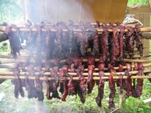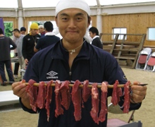 約20分間の休憩をはさんで、つぎに“燻製づくり”を行いました。この燻製は、小野田さんがサバイバル生活の中で編み出した保存食です。小野田さんから、ナイフの使い方、肉の切り方を教えてもらいました。肉を短冊状に切り分けた後、串に刺し、約60〜70度の火で炙り、燻製にしていきます。