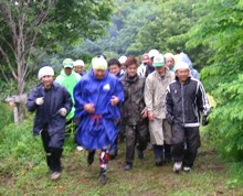 昼食を済ませ、午後からはいよいよ山へ。ビバーク(野営)ポイントまで、各自が寝袋、ブルーシート、薪、食材、調理用具など、たくさんの荷物を担いで、約2.5km.の山歩きに汗を流しました。