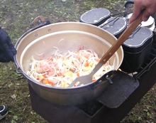 飯盒といっしょに鍋ものせてシチューをつくります