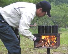 薪を割り火をおこして飯盒をのせます