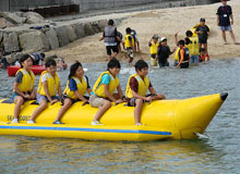 初めてバナナボートに乗る子どもたちは、歓声をあげスリルを楽しんでいました