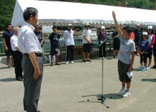 また、参加者並びに選手を代表して、濱田峻吾くん(南あわじ市南淡B&G海洋センター・南あわじ海洋クラブ)が選手宣誓を行い「この交流大会でマリンスポーツの楽しさや、 自然の大切さを学び、多くの仲間をつくり、カヌー大会では力いっぱいがんばります」と元気で大きな声で誓いました。
