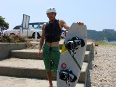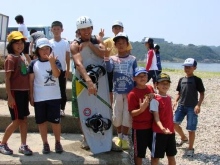 開会式後は、地元淡路島出身のプロウェイクボーダー西久保 元紀(にしくぼ もとき) 選手によるオープニングイベントがありました。西久保元紀選手は、8月4日、5日に東京お台場で開催される世界選手権の出場を控え、練習で忙しいときでありましたが、近畿各地から地元淡路島に訪れる子どもたちへ、ウェイクボードを披露するために来て頂きました。