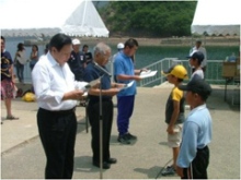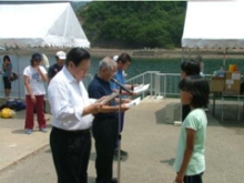 いよいよフィナーレを迎えました。 表彰式では、南あわじ市 中田 勝久 市長(左)、南あわじ市 塚本 圭右 教育長(中央)、南丹市園部B&G海洋センター 浅田 徳男 所長(右)より各部門で入賞した子どもたちへ表彰状が授与されました。