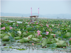 当日は、ハスの花が咲き誇る湖面を自由に行ったり来たりしていました。このほか会場の使用水面では「はすまつり」が開催されており、一面色華やかなハスで覆われていました。