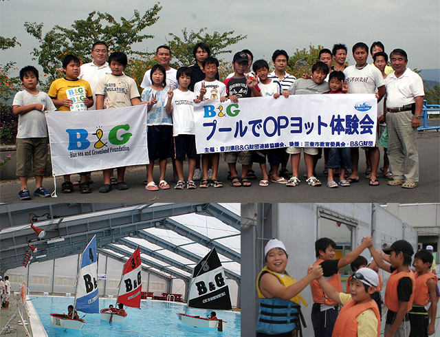 秋晴れの、9月9日(日)、香川県内8ヶ所のB&G海洋センター・クラブで構成する「香川県B&G財団連絡協議会」による、“プールでOPヨット体験会”が、香川県三豊市高瀬B&G海洋センターのプールで開催され、三豊市内の小学生10名が参加しました。