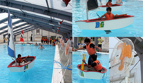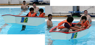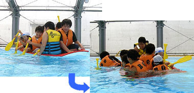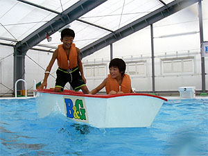 | ■船を後ろに傾けた場合と、水平にした場合、どっちがよく進むかな | ■落水時の対応を体験しよう | ||