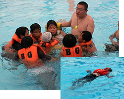 | どっちがよく進むかは、皆さんもやってみてください | 落水時に有効なHUDDLE POSITIONや背浮きも体験しました | ||