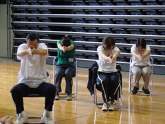 参加者のみなさんは、転倒寝たきり予防プログラムの基礎知識を学んだ後、実際に健脚度測定や室内でできる様々な運動プログラム体験しました。