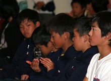 受賞後席で盾を見つめる小木曽君。