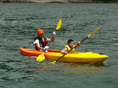 今年5月11日に、佐世保市小佐々B&G海洋センター「海洋スポーツ基地カヤックセンター」が建設されました。保護者と子どもたちは、新しい艇庫を利用して、カヌーやバナナボートなどのマリンスポーツを楽しみました。初めてカヌーに乗った子の中には不安そうな顔をしている子もいましたが、最後には笑顔で上陸していました。
