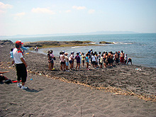 今日は、朝6時半に起床、宿舎の清掃をして、朝食となりました。午前9時半から施設内にある海岸で磯観察、天候は、昨日に引き続き晴れ。砂浜は裸足では歩けないほどに熱くなっていました。