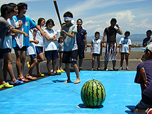 また、昼休憩では夏の定番となる【スイカ割り】が行われ、スイカを中心に大人も子どもも大歓声。割れたすいかはとても甘くて冷えており、みんな満足な笑顔でした。