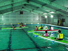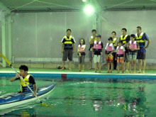 浦臼町では、今年度から新規事業として「プールde親子カヌー体験教室」を開催。まだ暑さが残る9月2日(火)、辺りも暗くなり始めた18:30頃に、5組10名の親子が海洋センターで受付を済ませました。