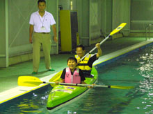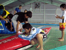 その後、プールに移動していよいよ待ちに待ったカヌー体験開始!っとその前に…、水面に出るときはきちんとライフジャケットの着用です。正しく着れているか親子で互いに確認します。