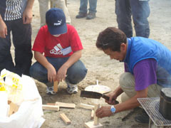 一斗缶に穴をあけ簡易な燻製かまを作ります。道具の使い方に気をつけるように子供たちが理解しやすいように身振り手振りで教えます。