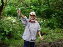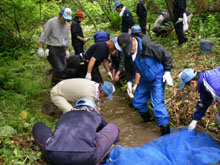 川をせき止めてマスつかみに挑戦!
