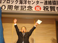 会場を別室に移し、扇谷会長のあいさつで祝賀会が始まり、広渡専務理事からは「全国10ブロック中、北海道ブロックに続いて2番目に20周年を迎えたいへん喜ばしい。記念誌も、分かりやすく作成され感謝している」、岡山県矢掛町 山野町長からは「東京都港区三田にあった当時の財団事務所へ、陳情に行った記憶が蘇った」と、それぞれお祝いの言葉をいただきました。