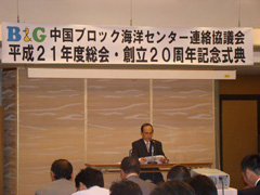 5月21日(木)、島根県松江市「ホテル白鳥」において、平成21年度中国ブロック海洋センター連絡協議会総会が開催され、中国ブロック全54センター中、43センターから、73名の関係者が出席しました。また、B&G財団の広渡専務理事をはじめ4名の方々を来賓としてお招きしました。