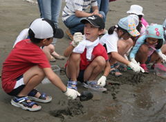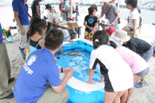 また、生物観察会も行われ、東邦大学研究員の中山さんの解説のもと、カニや貝などお台場の海の生物を観察しました。「こんなに生き物がいるなんて!!」と参加者から驚きの歓声があがるほど、多数のカニを発見。子ども達も大喜びで観察を行っていました。